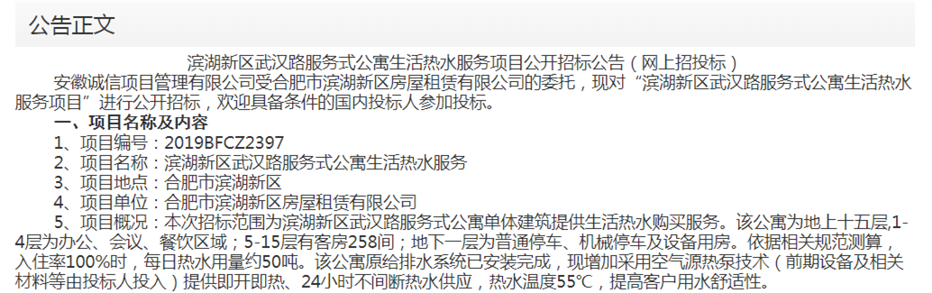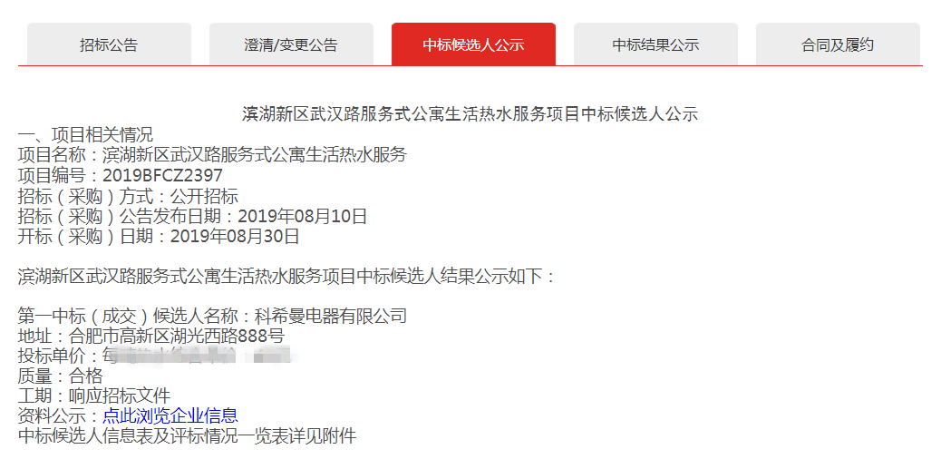 根據(jù)安徽合肥公共資源交易中心網(wǎng)站顯示,由合肥市濱湖新區(qū)房屋租賃有限公司公開招標(biāo)的濱湖新區(qū)武漢路服務(wù)式公寓生活熱水服務(wù)項(xiàng)目經(jīng)過評估篩選公布中標(biāo)結(jié)果,科希曼均符合項(xiàng)目要求成為唯一中標(biāo)單位。