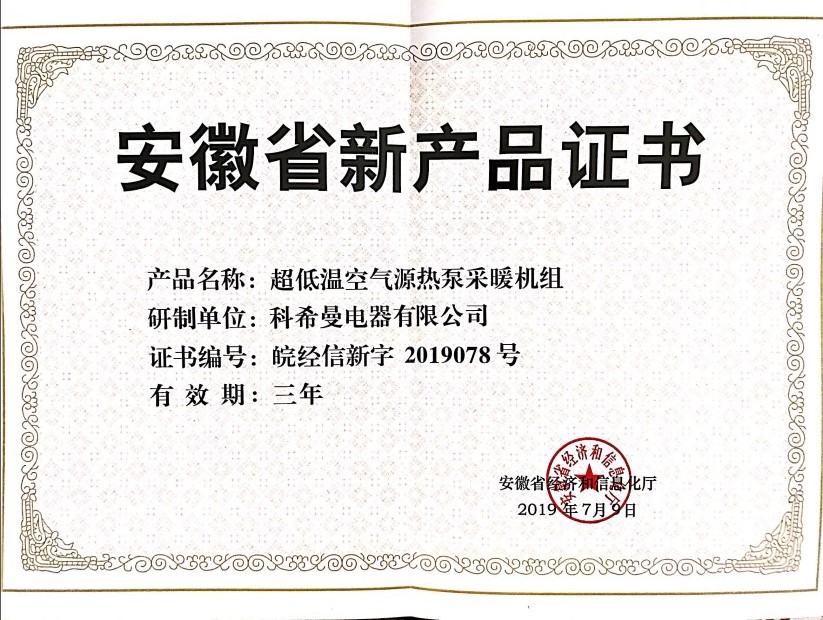 日前,安徽省經(jīng)濟(jì)和信息化廳公布了2019年度安徽省新產(chǎn)品(第二批)擬認(rèn)定名單。科希曼電器有限公司憑借超低溫空氣源熱泵采暖機(jī)組產(chǎn)品榮譽(yù)入圍,于2019年7月9日獲得證書。