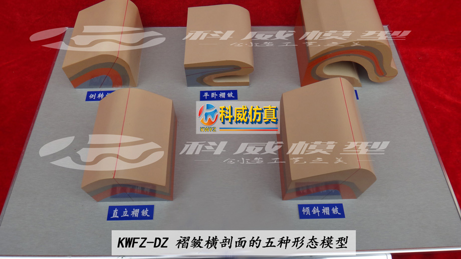 | KWDZ-74 | 褶皺按橫剖面的五種形態(tài)模型 | 1.5件/套,每件規(guī)格220×220×500,(規(guī)格單位為毫米); ★2.直立、傾斜、倒轉(zhuǎn)、平臥、翻卷五種; 3.有機玻璃成型,斷面分色,文字標(biāo)注。 | 5件/套 | 1 |